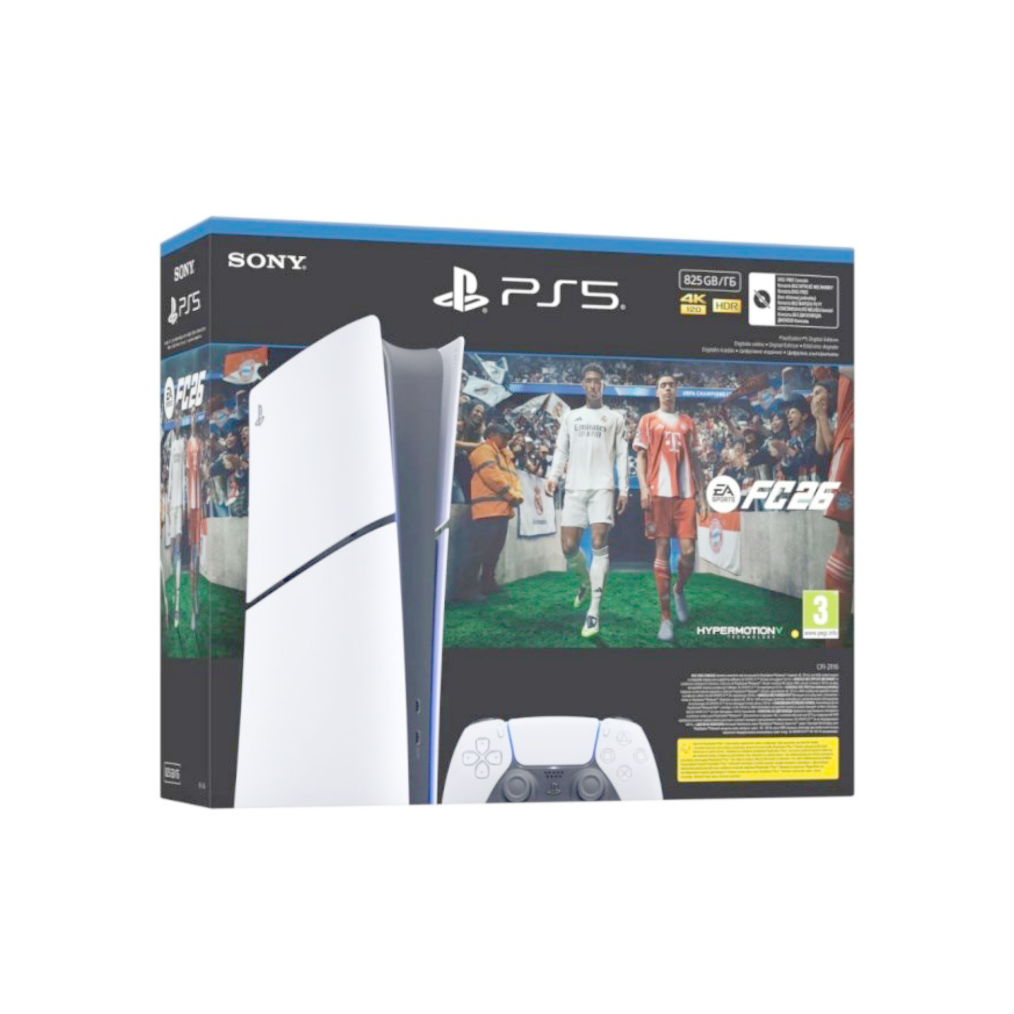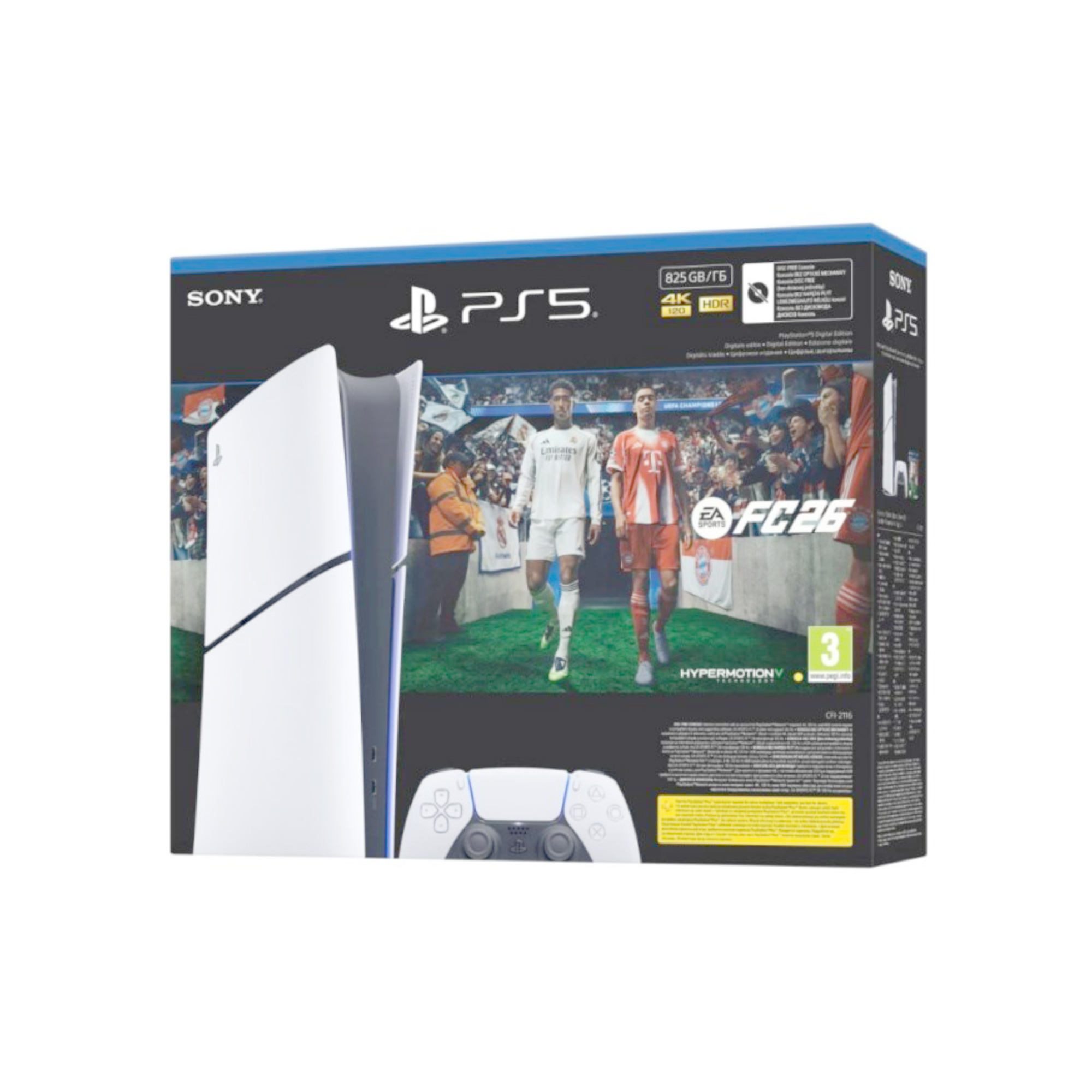 Sony PlayStation 5 Digital Edition. Platform: PlayStation 5, Product colour: Black, White, Internal memory: 16000 MB. Storage media: SSD, Internal storage capacity: 825 GB. Ethernet LAN data rates: 10,100,1000 Mbit/s, Ethernet interface type: Gigabit Ethernet, Wi-Fi standards: 802.11a,802.11b,802.11g,Wi-Fi 4 (802.11n),Wi-Fi 5 (802.11ac),Wi-Fi 6 (802.11ax). HD type: 8K Ultra HD, Supported video modes: 2160p,4320p. Power supply: 340 W – Bundle Sony PlayStation 5 EA Sports FC 26 – Warranty producer